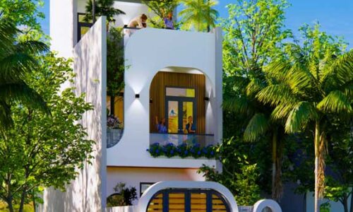 Thiết kế nổi bật với khối nhà vững chãi, đường cong mái vòm mềm mại và hệ cửa gỗ sang trọng, mẫu nhà phố 2 tầng này mang đến cảm giác hài hòa giữa hiện đại và truyền thống.