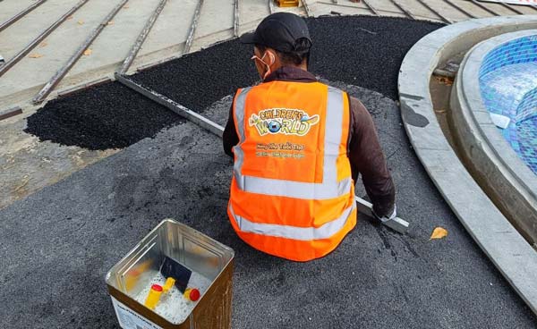• Sau đó, đổ hỗn hợp đã trộn lên khu vực cần thi công, dùng bay thép để dàn đều lớp cao su, đảm bảo độ phẳng và đồng đều về độ dày.