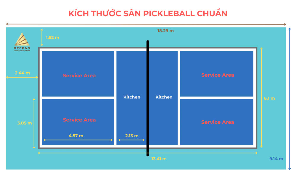 – Sân đơn và sân đôi: 6,1m x 13,41m