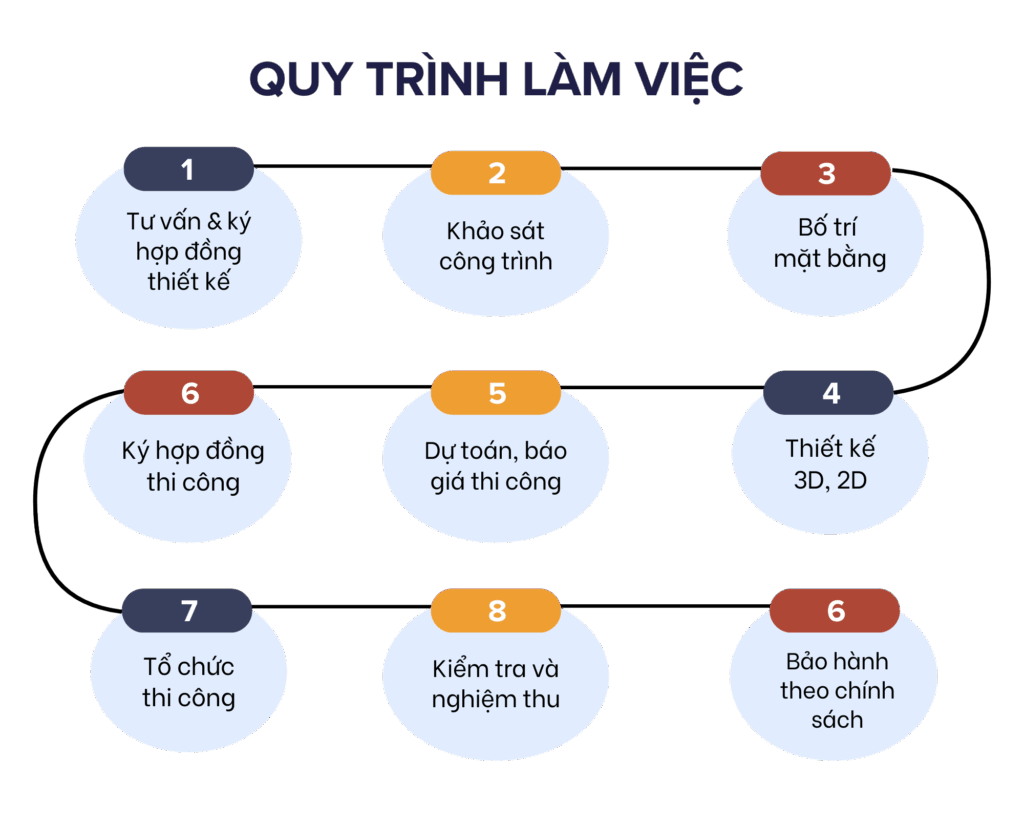 1. Khảo sát & tư vấn thiết kế: diện tích, hướng ánh sáng, kết hợp thiết kế nội thất cho khu vực phụ trợ (cửa hàng, phòng thay đồ…).