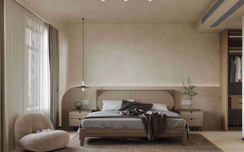 Phòng ngủ Wabi Sabi thường sử dụng giường gỗ mộc, ánh sáng dịu và ít vật dụng không cần thiết – tạo nên môi trường nghỉ ngơi tĩnh lặng và thư thái.